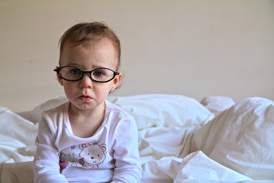 Esmé found my old glasses and decided they are the coolest thing. I popped the lenses out and now she wears them all the time. She puts them on first thing in the morning, wears them while she's playing or eating or when we go out, and even wears them to bed.
